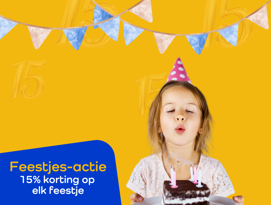 Ben jij binnenkort jarig? Of plan je een verjaardagsfeestje tijdens de zomervakantie? Dan hebben we goed nieuws voor jou! Boek je feestje tussen 15 mei en 15 juni en ontvang 15% korting met de discountcode 'FEESTMAAND15'!